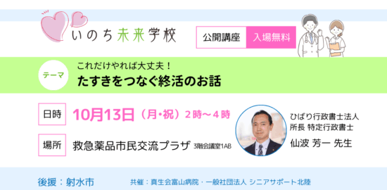 エンディングノートについても説明します日時10月13日(月・祝) 午後2時~4時場所救急薬…