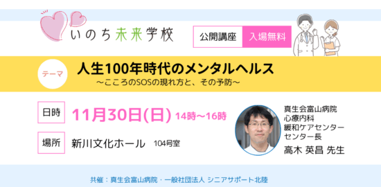 日時11月30日(日)午後2時~4時場所新川文化ホール104号室講師真生会富山病院心療内科緩和ケア…