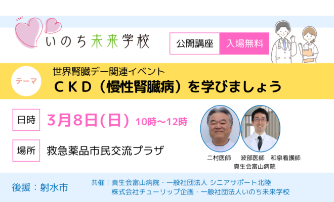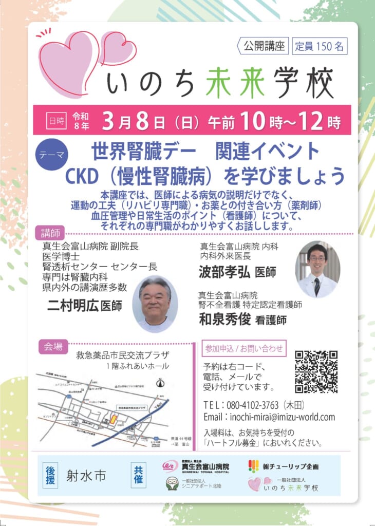 | 講師 | 真生会富山病院 副院長 内科 腎透析センター センター長 医学博士 二村明広医師 内科 内科外来医長 波部孝弘医師 腎不全看護特定認定看護師 和泉秀俊看護師 |